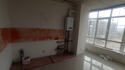 В квартире выполнена предчистовая отделка: стяжка пола и штукатурка стен. Установлен газовый двухконтурный котел, радиаторы.